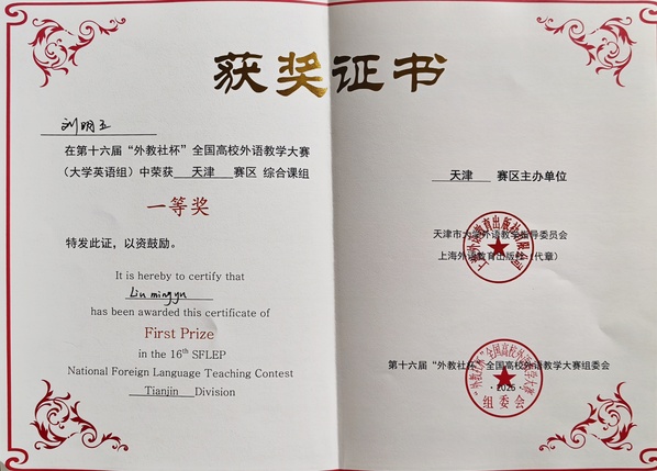 近日,第十六届“外教社杯”全国高校外语教学大赛天津赛区(大学英语组)决赛在天津财经大学落下帷幕。经过激烈角逐,我校通识教育学院刘明玉老师荣获综合课组一等奖,王怡老师荣获视听说课组一等奖。两位教师凭借扎实的专业功底、精湛的教学技艺和出色的现场表现,充分展现了我校外语教师的教学风采与育人实效。本次大赛由天津市大学外语教学指导委员会与上海外语教育出版社共同主办,分为综合课组和视听说课组两个组别,赛事流程包括初赛、复赛和决赛三个阶段。在中国高等教育学会发布的“全国普通高校教师教学发展指数”中,“外教社杯”全国高校外语教学大赛连续多年入选并蝉联外语类竞赛首位,是我国最具影响力的外语类赛事之一。学校一贯重