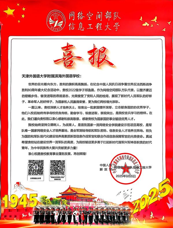 在隆重举行的纪念中国人民抗日战争暨世界反法西斯战争胜利80周年盛大活动中,米兰网页版登录入口附属滨海外国语学校(以下简称“滨海小外”)2022届毕业生邢逸晨作为中国人民解放军网络空间部队方队代表,以昂扬的姿态和整齐的步伐光荣通过天安门广场,接受党和人民的检阅。阅兵场上,邢逸晨步伐铿锵、意气风发,展现了新时代革命军人的良好风貌,彰显了新时代人民军队的强军风采。他以出色的表现赢得了广泛赞誉,为国家和军队赢得了荣誉。在滨海小外6年培养期间,邢逸晨表现优异,品德端正,勤奋好学,心怀家国,立志国防。他的成长成才,是学校始终坚持立德树人、深耕人才培养的生动体现。学校十分重视学生爱国主义教育和国防意识培养,鼓励