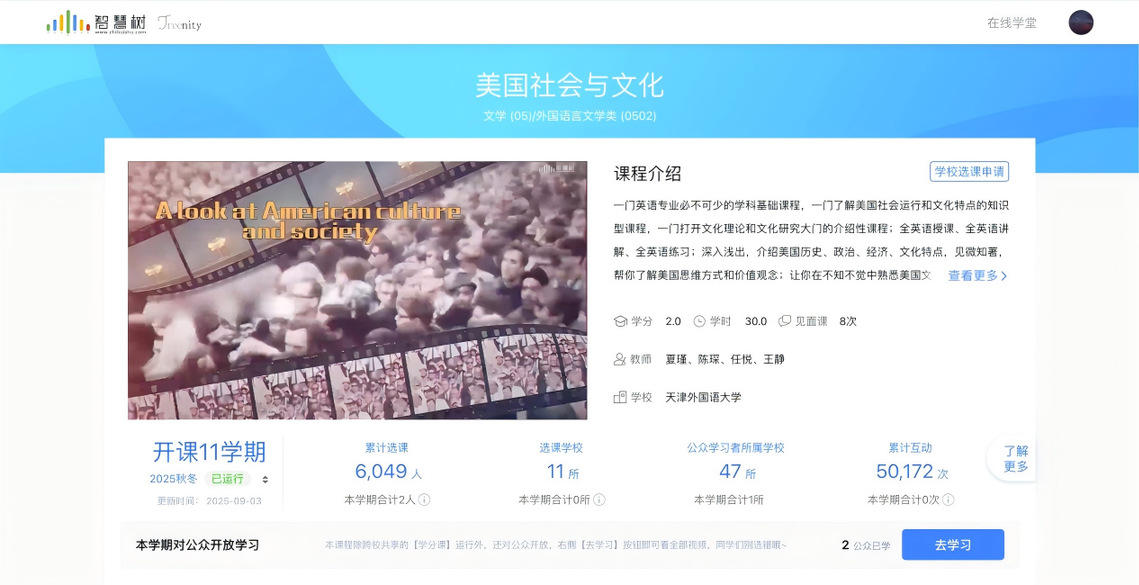 近日,智慧树网公布了2024-2025年度“在线共享精品课程”评选结果,我校《美国社会与文化》《学术英语写作》《个人理财》三门课程成功入选,这是学校在课程建设方面取得的又一阶段性成果,充分展示了天外在教育数字化和课程共享领域的积极探索与丰硕收获。三门入选课程紧扣国家发展对人才能力的核心需求,彰显鲜明的时代价值与育人特色。《美国社会与文化》面向外语类与国际教育专业学生,系统讲授美国社会历史、政治制度、经济形态及文化特色,帮助学生加深对跨文化差异的理解与认知,提升跨文化沟通与全球化背景下的思辨能力。《学术英语写作》聚焦国际学术交流能力培养,从论文选题、研究方法到写作规范、逻辑表达,全面提升学生的学