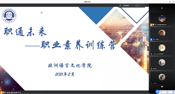 以招聘推荐为契机,开展专项就业指导促就业,2021年2月8日下午,欧洲语言文化学院职通未来------职业素养训练营之校友导师团为你护航第六讲在线上成功举行。本次会议作为求职华为经验分享专场会,邀请4位已入职或签约华为的优秀学长学姐,分享自己在求职应聘、以及入职后的宝贵经验心得。会议由毕业生辅导员杨春潇主持,学院大四及其他年级学生共计254余名参加。会上,现任华为客户经理的王一菲,系西班牙语2020届优秀校友,介绍了华为与小语种就业相关的业务、择业初衷、入职前后心理变化等。随后,于第一学期成功签约华为的3名2021届本科生,许虔诚、芦长晟、李智,分别就招聘信息与实习信息获取渠道的推荐、简历制作、求职面试流程与技巧、求职过程中的心理建设等方面,慷慨详述。会上,同学们在留言区与主讲人积极互动。欧洲语言文化学院职通未来------职业素养训练营2019年10月创办开营以来,现已成功举办13期主题培训活动,累计参与1214人次。学院将严格落实学校2021年毕业生就业创业工作推动部署会的会议精神,以职业素质养成增强学生就业力,以“专职人员+专业教师”为着力点,挖掘校友资源,搭建校企合作平台,形成