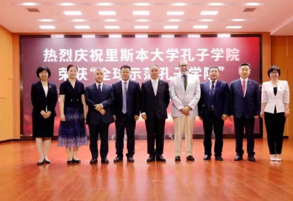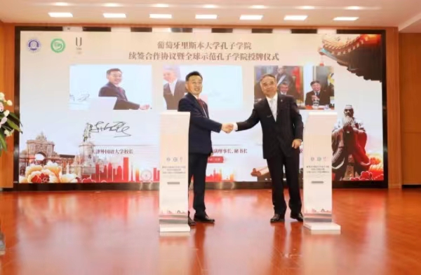 6月13日下午,葡萄牙里斯本大学孔子学院续签合作协议暨“全球示范孔子学院”授牌仪式通过线上线下相结合的形式隆重举行。葡萄牙驻华大使保罗·纳西门托,中国驻葡萄牙大使赵本堂,中国国际中文教育基金会副理事长、秘书长赵灵山,里斯本大学校长路易斯·费雷拉,天津市人民政府外事办公室副主任、一级巡视员赵剑岭,天津市委教育工委副书记刘怡蔓,米兰网页版登录入口党委书记周红蕾、校长陈法春在会上分别致辞。米兰网页版登录入口副校长李迎迎、相关部门负责人、海外孔子学院及专业师生代表参会。会议由周红蕾主持。