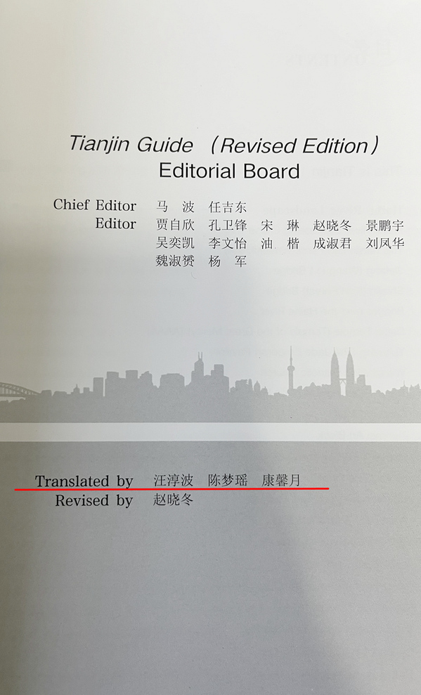 近日,《天津指南》(修订版)的英文版Tianjin Guide(Revised Edition)由天津大学出版社出版发行。Tianjin Guide(Revised Edition)由米兰网页版登录入口中国特色社会主义理论体系国际传播外译研究中心(以下简称“外译中心”)主任、英语学院教师汪淳波教授带领研究生陈梦瑶、康馨月完成翻译工作。