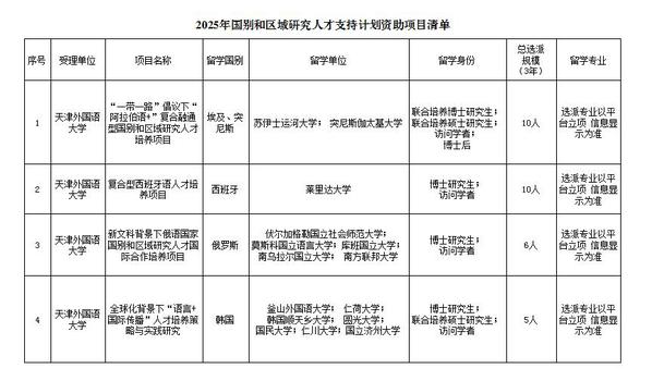 国家留学基金委员会国别和区域研究人才支持计划,旨在服务国家对外开放大局、“一带一路”倡议、人类命运共同体建设需要,采取“先立项,后选拔”的项目制选派模式,加快培养和储备一批具有国际视野、通晓国际规则、能够参与国际事务的国别区域问题研究人才。天外欧洲语言文化学院、亚非语学院,依托教育部国别与区域研究中心等平台,结合学校学科建设与人才培养的特色与优势积极申报,最终“‘一带一路’倡议下‘阿拉伯语+’复合融通型国别和区域研究人才培养项目”“复合型西班牙语人才培养项目”“新文科背景下俄语国家国别和区域研究人才国际合作培养项目”“新时代外语人才‘传播当代中国能力’培养案例库建设研究”4个项目获批立项,项目执行期为2025至2027年,三年期间天外可自主选派31名师生赴埃及、突尼斯、西班牙、俄罗斯、韩国合作高校交流学习,形式涵盖博士后、访问学者、攻读博士学位、联合培养硕博研究生等。