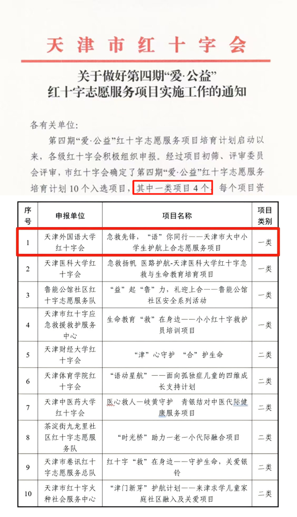 日前,在天津市红十字会组织的第四期“爱·公益”红十字志愿服务项目评审中,天外红十字会申报的“急救先锋,‘语’你同行——天津市大中小学生护航上合志愿服务项目”以综合排名第一的成绩入选一类项目,这也是我校第二次获批天津市红十字会“爱·公益”红十字志愿服务项目。