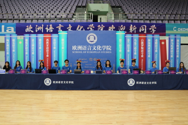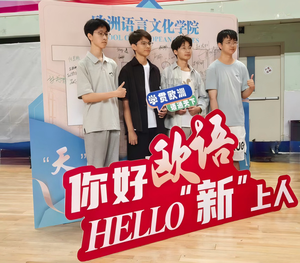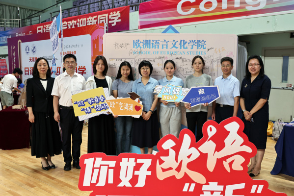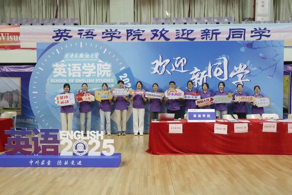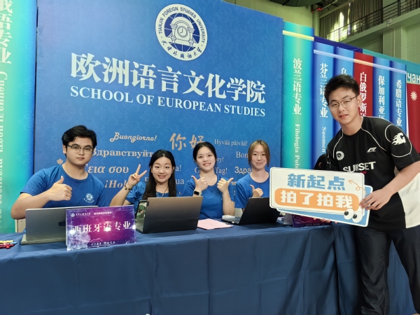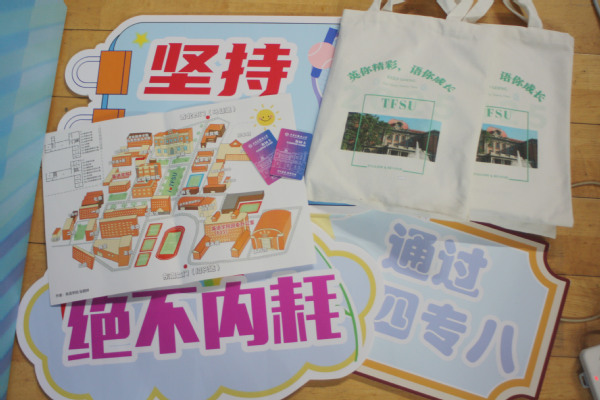 欧洲语言文化学院的迎新背景板由代表学院的这本书和象征16个专业的16本书共同组成——拼成一道“知识之门”,每个梦想都将在此启程。新生们可在寓意米兰网页版登录入口与上合精神的“‘天’作之‘合’”展板上签名留念,正式成为“天外欧语人”。学院贴心准备了多语种“你好”手提袋和卡套以及可自由拼字的创意文具,陪伴新生从第一声问候走向世界,记录每一个闪光的起点。