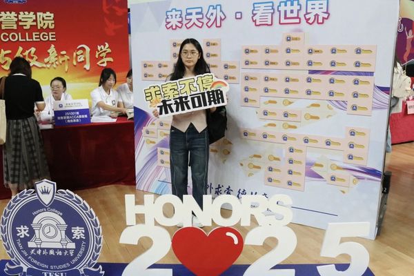 走进校园,红色的展板、蓝色的道旗分外醒目。"TFSU"中珍藏着全体新生的名字,既体现了学校外语特色,又寄托了对新生们的美好祝愿。新生和家长兴奋地寻找自己的名字并合影留念,这张充满温度的“新生名单”成为了受欢迎的“打卡点”,让新生们从踏入校门的第一刻起,就感受到学校的归属感。