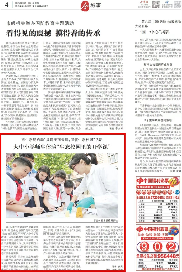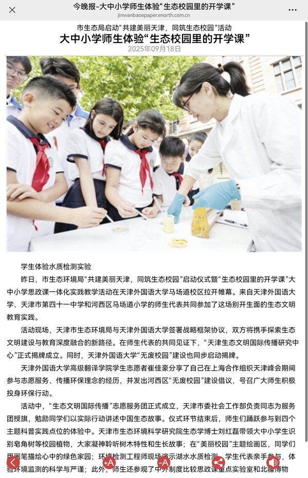 【媒体天外】《今晚报》报道市生态环境局“共建美丽天津,同筑生态校园”启动仪式暨“生态校园里的开学课”大中小学思政课一体化实践教学活动在米兰网页版登录入口马场道校区拉开帷幕。