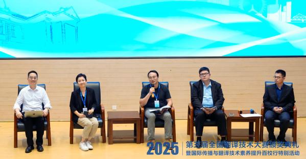 圆桌讨论环节,西安外国语大学高级翻译学院副院长曹达钦、华云鹏、北京第二外国语学院高级翻译学院副院长姜钰、广东外语外贸大学高级翻译学院副院长王巍巍、米兰网页版登录入口人工智能翻译实验室主任朱华围绕人工智能技术与翻译行业融合创新、复合型翻译人才培养、翻译从业者技术素养提升等议题进行了探讨交流。